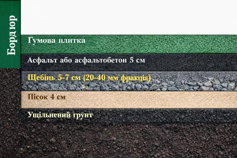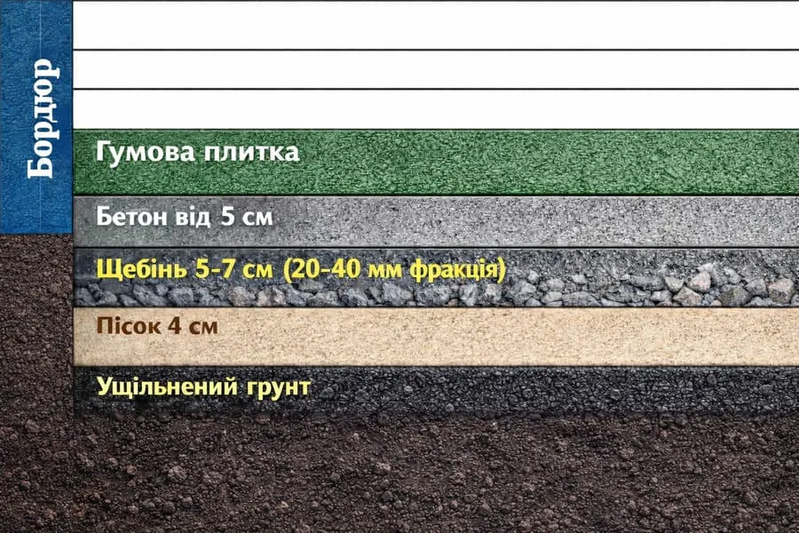 1. Гумове покриття товщиною від 12 до 50 мм укладається на тверду основу або щільно утрамбовану піщано-гравійну суміш.
