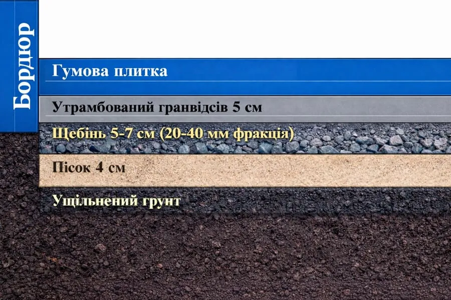 5. При укладанні на ПГС основу бажано обмежити бордюром по периметру майданчика або доріжки. Оптимальний варіант — гумовий бордюр, який встановлюється так само, як і бетонний, заглиблюючись у ґрунт.