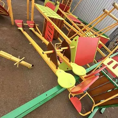 • використання надійних та довговічних матеріалів, що вирізняються оптимальною стійкістю до зносу – здебільшого це металевий профіль, в якому ретельно затерті шви, та фанера з мінімальним коефіцієнтом гігроскопічності, що гарантує її вологостійкість (наші вуличні дитячі майданчики здатні багато років витримувати опади та низькі температури);