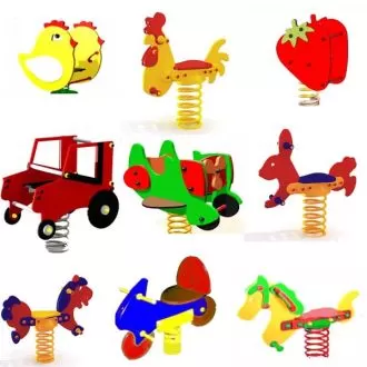 Практично вся основа дитячих качель на пружинці виготовлена з металевого профілю, декоративна частина зроблена з вологостійкої фанери. Щільність металу та фанери залежить від самої конструкції та відповідає нормам безпеки із сертифікації виробів для парків та розважальних ігрових комплексів. Для фарбування використовуємо синтетичну емаль для металу й акрилова на водній основі для фанери та дерева. Такий спосіб фарбування за якістю не поступається автомобільному фарбуванню, нічим не поступається порошковому фарбуванню. Як результат для клієнта гарна кольорова гама, якісна фарба та дешевше за ціною від тої самої порошкової покраски. Загалом ми виробляємо вуличну продукцію із металу, але є макети для виробів із бруса та дерева. Більше фото можна переглянути у розділі "Наші Роботи".
