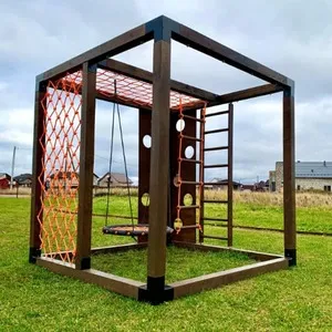 Основою ігрового куба є міцний каркас, який забезпечує стабільність і довговічність. У конструкції можуть використовуватися металеві, дерев’яні або фанерні елементи, а також канатні вставки для лазіння.