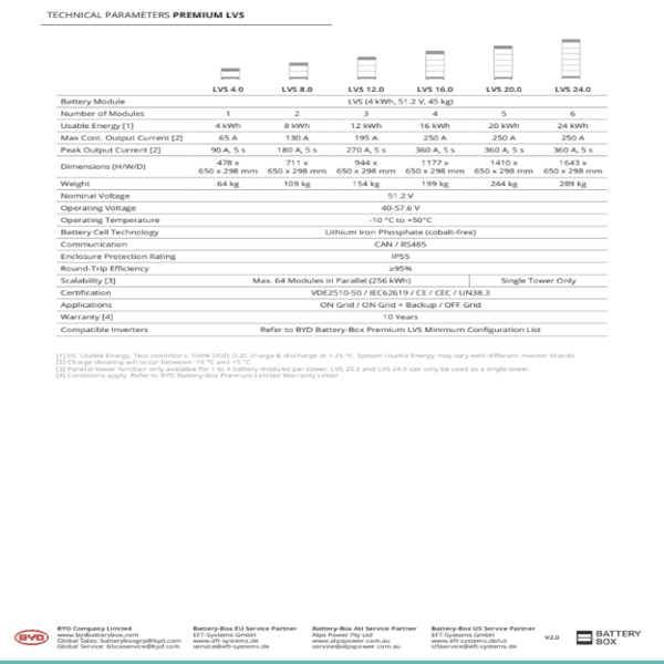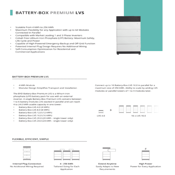 Акумуляторна батарея BYD Battery-Box Premium LVS 4.0 - це комплект всіх необхідних приладів: кабінет + БМС + конектор + АКБ. Придбання такої батареї дійсно вдале рішення, як для населення, так і для бізнесу. Вона допоможе забезпечити енергозалежність, сприятиме економії за рахунок зберігання надлишкової енергії та підтримуватиме стабільну роботу системи під час перебоїв з мережею.