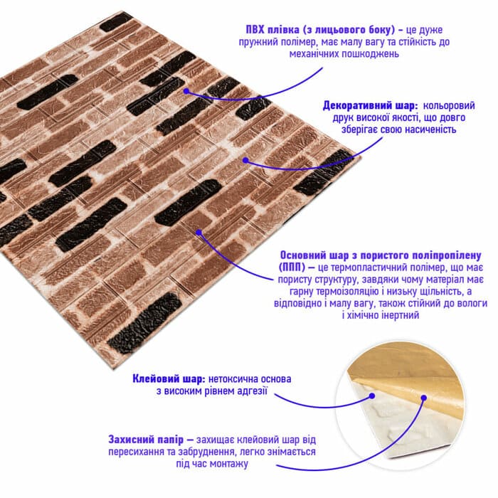 • Безпека: основа 3Д панелей самоклеючих м’яка, тому можна не перейматись про побутовий травматизм;