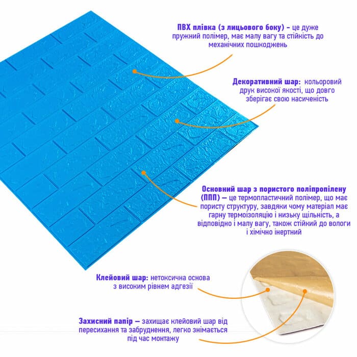 3D панель самоклеюча цегла Синій - відмінне декоративне покриття, призначене для облицювання стін. Вона виконана із легкого і водночас дуже міцного матеріалу, мова про пористий поліпропілен (ППН). Головною особливістю якого є оригінальний рельєфний малюнок у вигляді цегли (колір може бути будь-який), але це не все. Ще в такому матеріалі наявний клейовий шар, завдяки якому встановлення 3Д панелей вважається абсолютно легким і дуже швидким. Вам не потрібні будуть жодні додаткові матеріали, адже такі панелі "клеяться самі по собі".