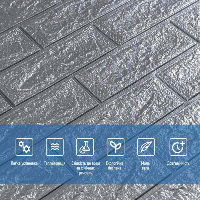 3D панель самоклеюча цегла Срібло - відмінне декоративне покриття, призначене для облицювання стін. Вона виконана із легкого і водночас дуже міцного матеріалу, мова про пористий поліпропілен (ППН). Головною особливістю якого є оригінальний рельєфний малюнок у вигляді цегли (колір може бути будь-який), але це не все. Ще в такому матеріалі наявний клейовий шар, завдяки якому встановлення 3Д панелей вважається абсолютно легким і дуже швидким. Вам не потрібні будуть жодні додаткові матеріали, адже такі панелі "клеяться самі по собі".