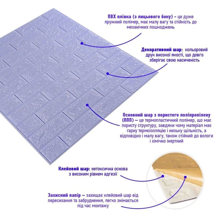 3D панель самоклеюча цегла Світло-Фіолетовий- відмінне декоративне покриття, призначене для облицювання стін. Вона виконана із легкого і водночас дуже міцного матеріалу, мова про пористий поліпропілен (ППН). Головною особливістю якого є оригінальний рельєфний малюнок у вигляді цегли (колір може бути будь-який), але це не все. Ще в такому матеріалі наявний клейовий шар, завдяки якому встановлення 3Д панелей вважається абсолютно легким і дуже швидким. Вам не потрібні будуть жодні додаткові матеріали, адже такі панелі "клеяться самі по собі".