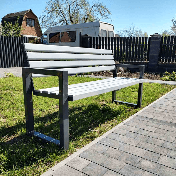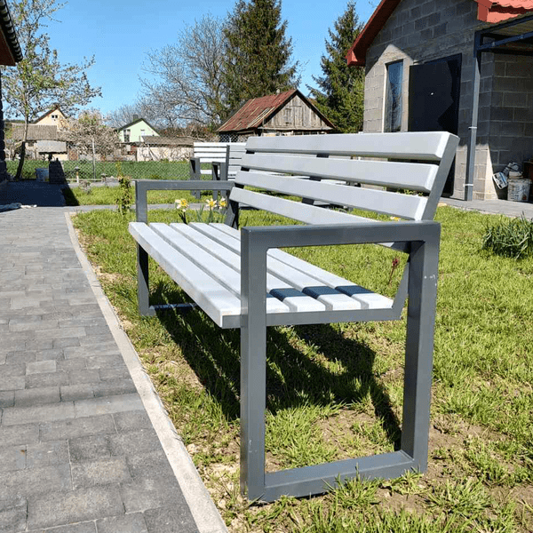 Профіль сталевий 60х40. Покритий фарбою 3в1. Брус 3х4 покритий проти грибковим ґрунтом. Максимальне навантаження 400кг. Висота сидіння 450мм.