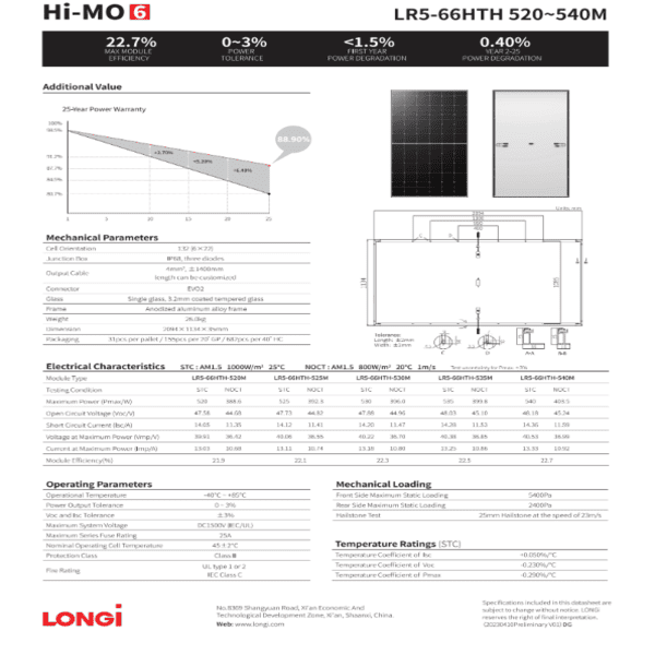 Сонячна панель LR5-66HTH-525M від відомого виробника Longi Solar — це відмінний варіант для житлових та комерційних приміщень. Її конструкція компактна, зовсім не габаритна, завдяки чому місця для її встановлення потрібно абсолютно небагато. Покриття панелі антиблікове, що допомагає зменшити відбиття світла і значно поліпшити процес перетворення енергії. Панель виготовлена із високоякісного матеріалу, тому термін служби має довгий, а робота її 100% надійна. Тож у разі, коли потрібна сонячна панель, ціна якої абсолютно виправдана якістю, то модель LR5-66HTH-525M — це справді ідеальний варіант!
