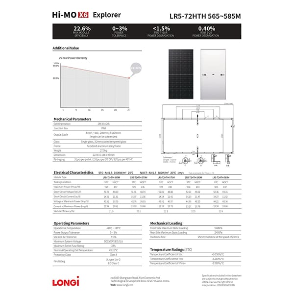 Сонячна панель LR5-72HTH-580M від відомого виробника Longi Solar — це відмінний варіант для житлових та комерційних приміщень. Її конструкція компактна, зовсім не габаритна, завдяки чому місця для її встановлення потрібно абсолютно небагато. Покриття панелі антиблікове, що допомагає зменшити відбиття світла і значно поліпшити процес перетворення енергії. Панель виготовлена із високоякісного матеріалу, тому термін служби має довгий, а робота її 100% надійна. Тож у разі, коли потрібна сонячна панель, ціна якої абсолютно виправдана якістю, то модель LR5-72HTH-580M — це справді ідеальний варіант!