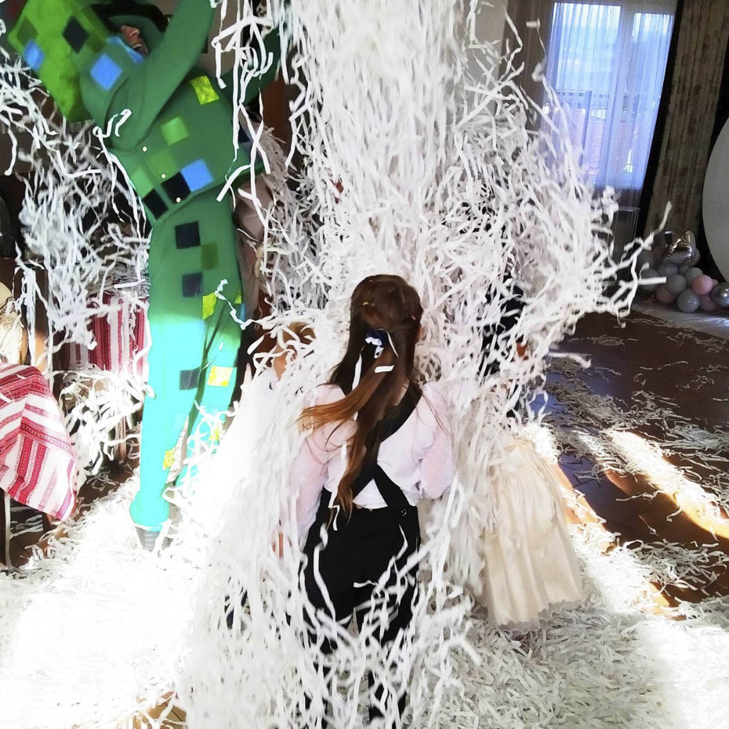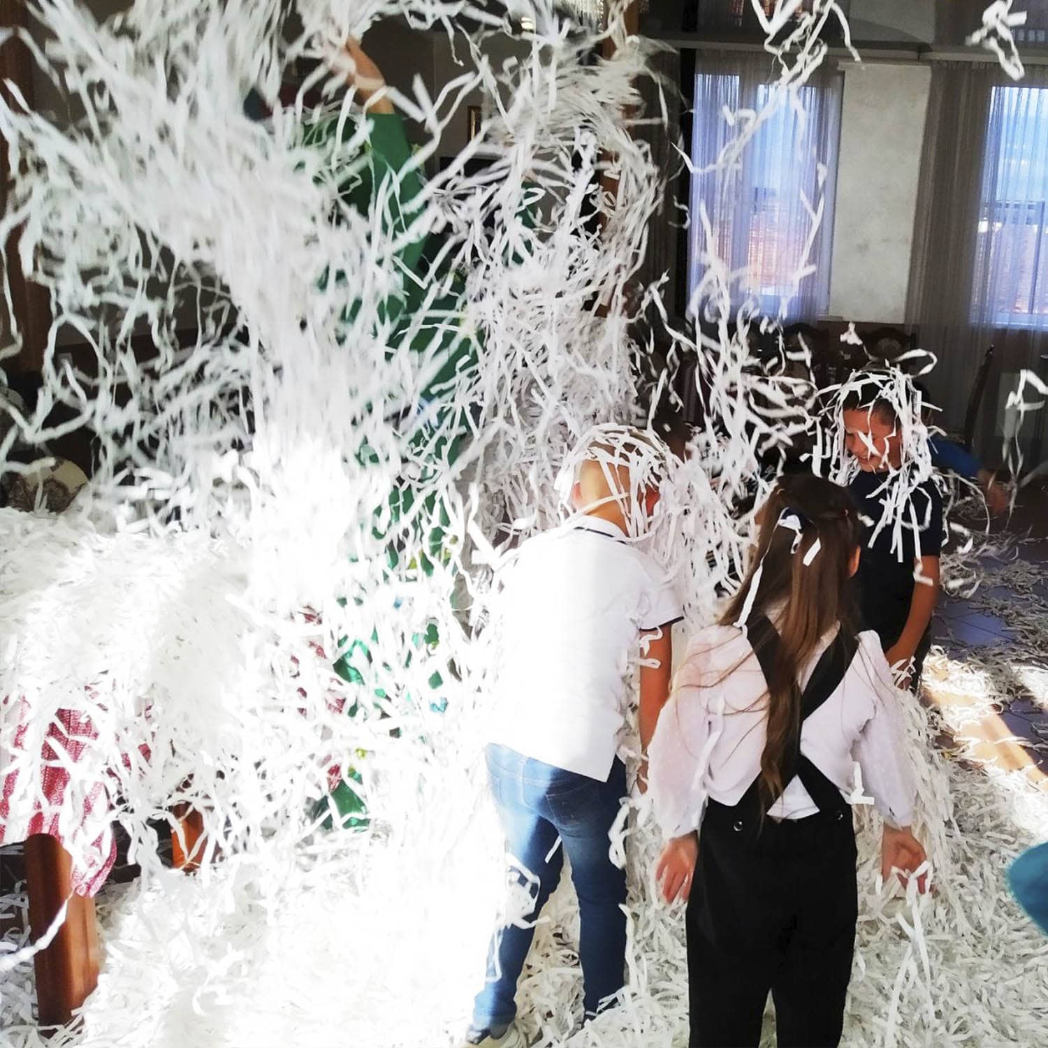 Папір приходить в ящику у пресованому стані. Щоб заполонити білим папером все приміщення потрібно його розпушити. Для цього потрібна пушка для паперового шоу. Якщо такої немає не біда. Потрібно просто підкидати папір вгору як на відео.