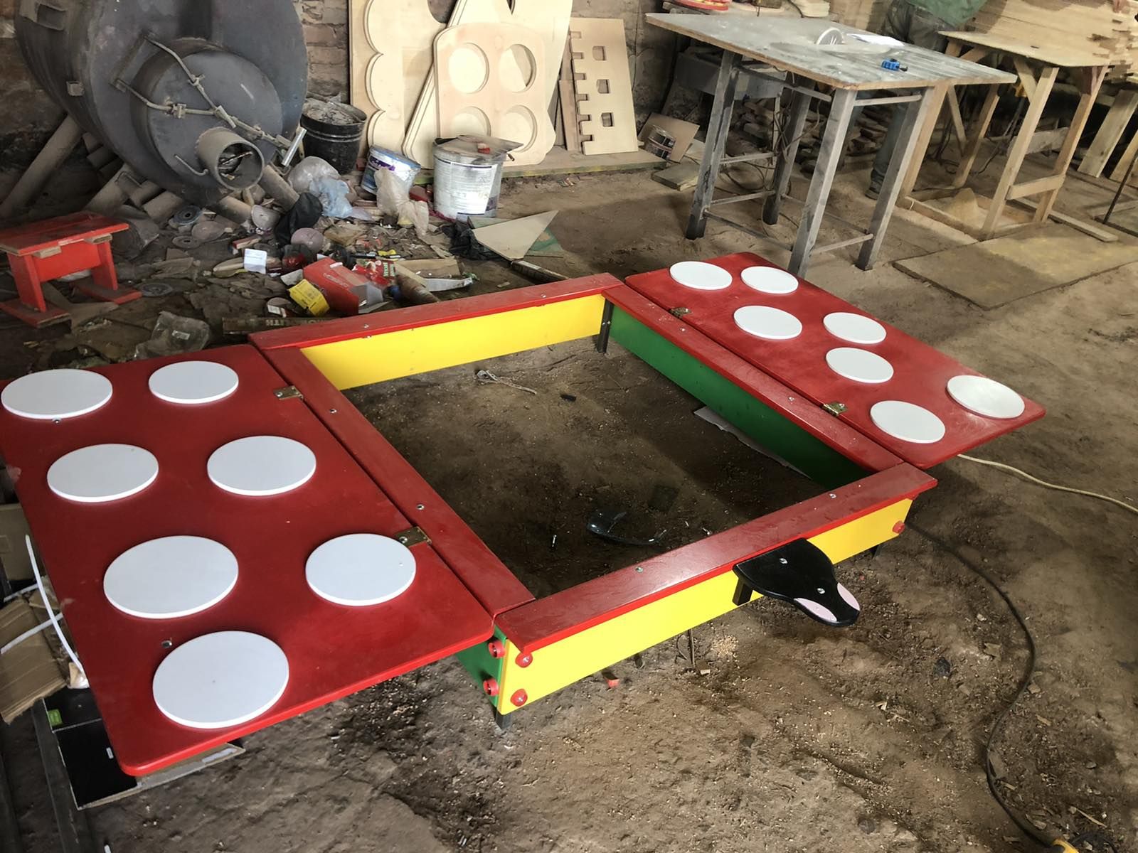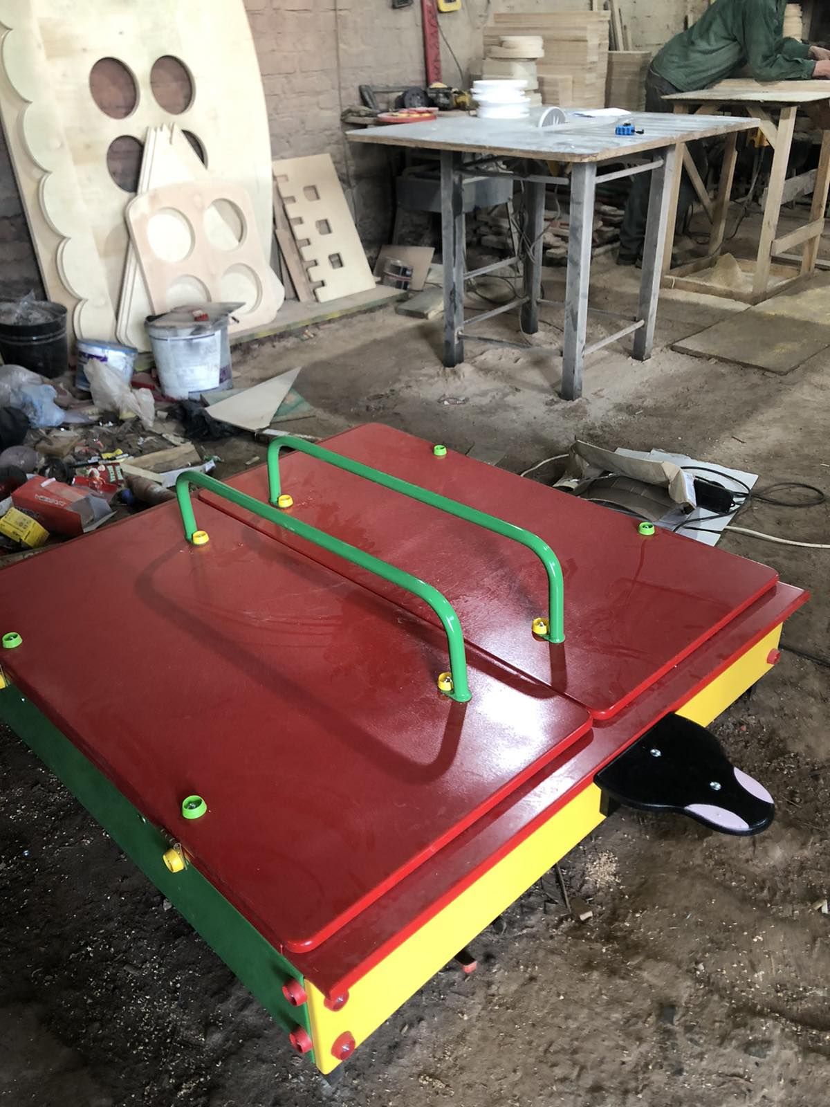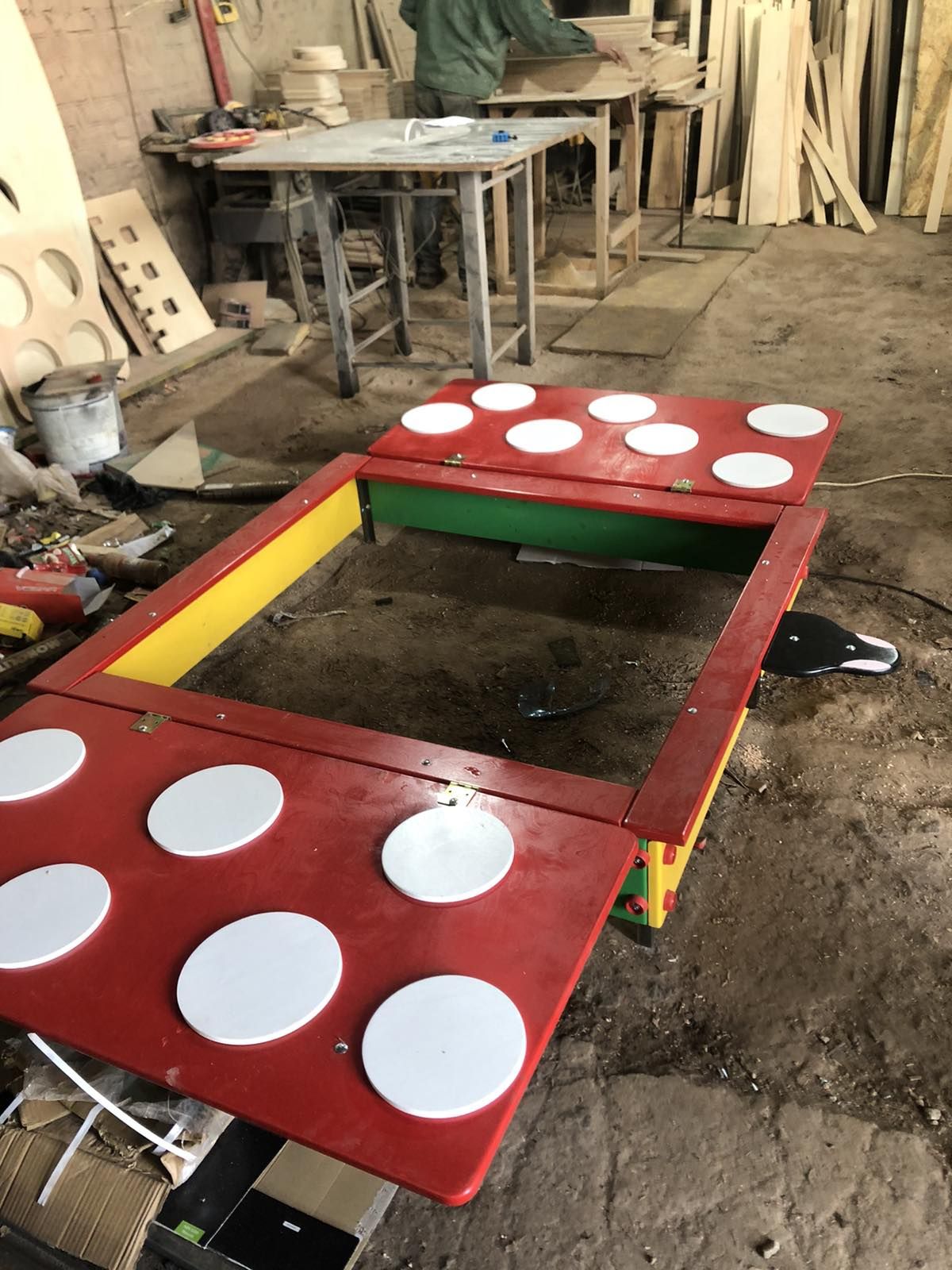 Колір будь-який. Основа профільна труба, фанера вологостійка, покраска емаль синтетична для металу та акрилова на водній основі для фанери та дерева. 3000х1750х330 мм