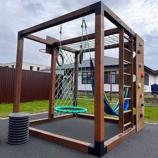 ▪️Можливість індивідуального налаштування комплектації під конкретний майданчик: можна обрати потрібні елементи (канати, сітки, рукоходи, драбини, кільця тощо) та адаптувати комплекс під вік дітей і доступну площу.