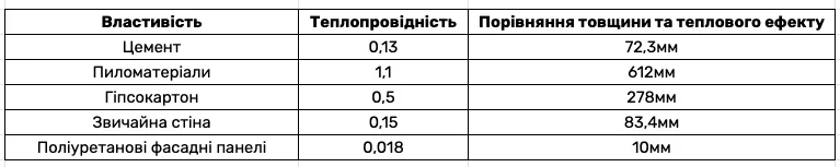 1. Високий рівень теплоізоляції: такі панелі характеризуються високим коефіцієнтом теплоізоляції, завдяки чому в будівлі зберігається тепло, а витрати на опалення значно зменшуються. Крім того це забезпечує комфорт у внутрішньому приміщенні (до прикладу, 25 мм пінополіуретану утеплюють тим же чином, що і 65 мм пінопласту).