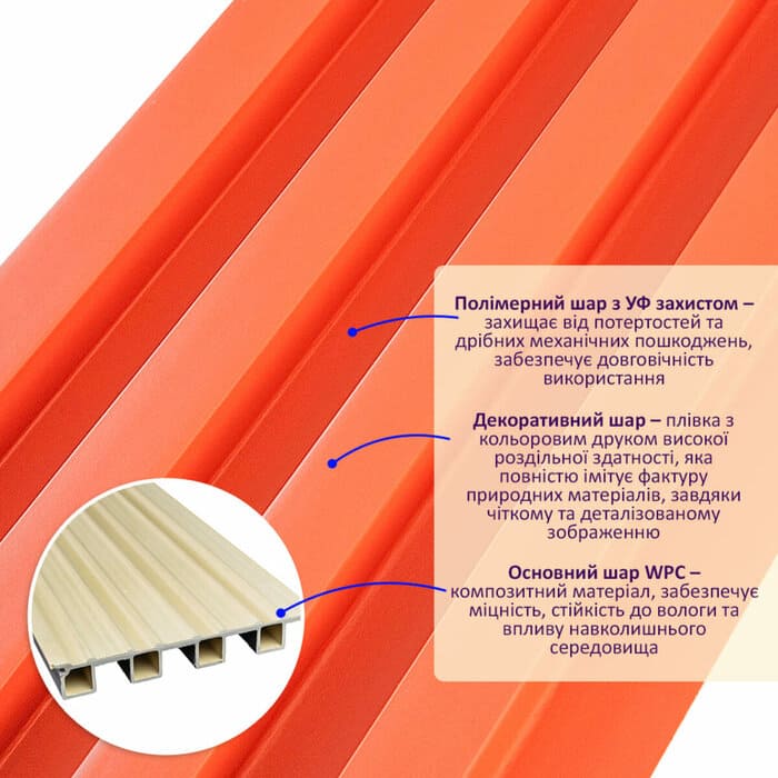 - фактура: гладка, імітація дерев'яної рейки.