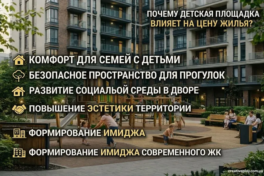 Для покупателей жилья важна не только сама квартира, но и среда, в которой они будут жить. Детская площадка создает дополнительную ценность для жилого комплекса, особенно, если речь идет о семейной аудитории. Основные причины воздействия: