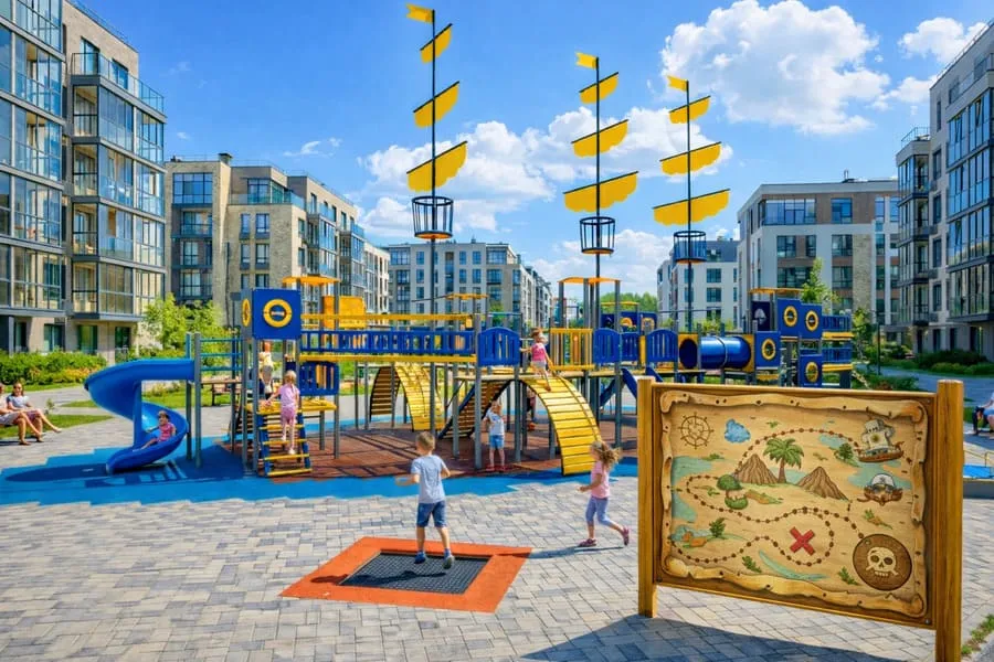 Во многих современных жилых комплексах детская площадка становится центральным элементом двора. Вокруг него формируются зоны отдыха, пешеходные дорожки и зеленые просторы. Такой подход меняет восприятие территории: двор выглядит не как парковка у дома, а как полноценное общественное пространство для жителей. Преимущества для покупателей: