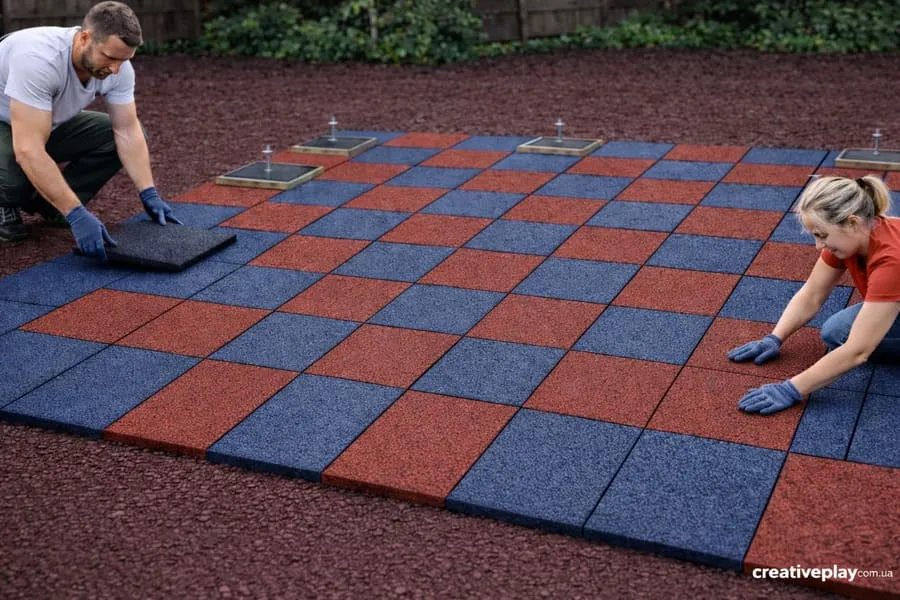 Когда основание полностью уплотнено и выровнено, переходят к укладке покрытия. Есть разные решения. Сегодня достаточно часто используют резиновую плитку для детских площадок, поскольку она хорошо амортизирует падение, не скользит и выдерживает интенсивную эксплуатацию. Такое решение практично в уходе и позволяет при необходимости заменять отдельные элементы без ремонта всей площади.