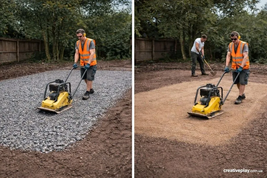 Качественная основа – главное условие долговечности площадки. Она предотвращает перекосы, проседание и разрушение покрытия. Чаще всего производят многослойную конструкцию. Сначала насыпают щебень, затем песок, после чего каждый слой тщательно уплотняют. Такая подушка равномерно распределяет нагрузку от оборудования и активных игр.