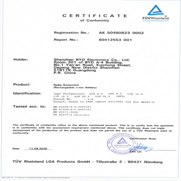 - Сертификация: VDE2510-50/IEC62619/CE/CEC/UN38.3.