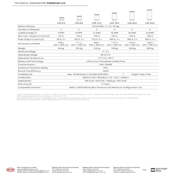 Кроме того, энергоэффективность такой АКБ действительно высока (КПД до 95%). Она идеально подходит для частого использования, глубокие циклы разрядки ей не страшны. Конечно, начальная цена на аккумуляторную батарею BYD Battery-Box Premium LVS 16.0 выше, чем на другие типы такой продукции, но уверяем вас, что это действительно выгодная инвестиция благодаря длительному сроку службы. LiFePO4-батареи являются идеальным выбором для применений, требующих надежности, безопасности и длительного функционирования.