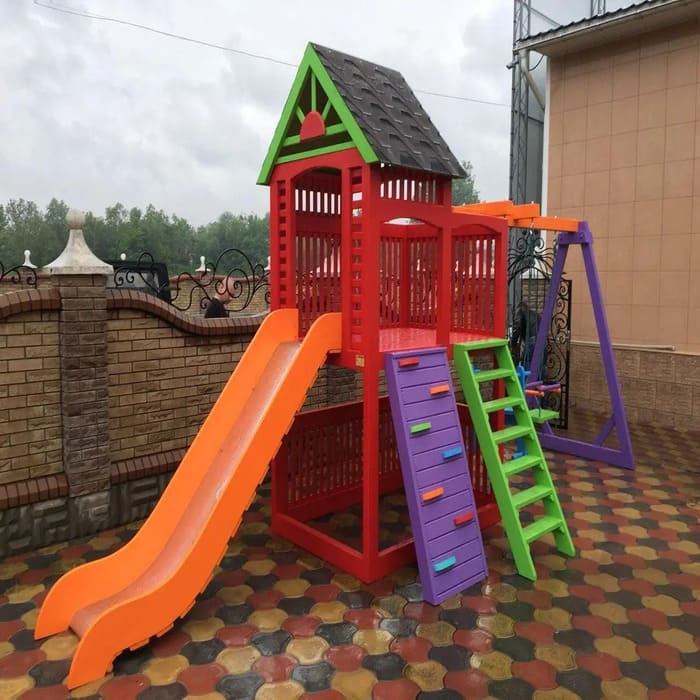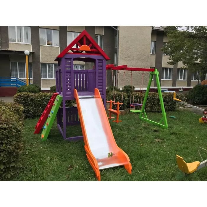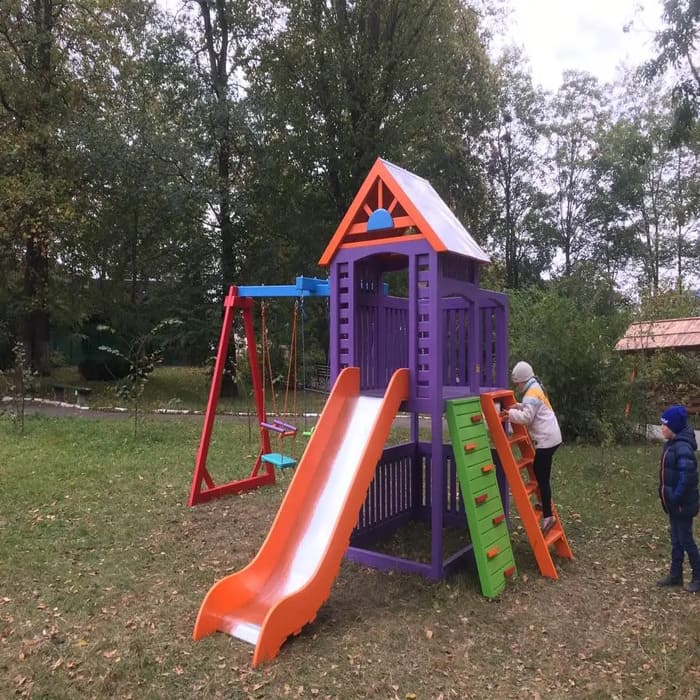 Цветовое исполнение детской площадки остается на усмотрение производителя. В случае, если вы хотите покрасить комплекс в конкретный цвет (или несколько цветов, или с определенной подетальной очередью), то обязательно письменное оформление Спецификации к заказу с вашим личным визированием документа. Кроме того, отмечаем, что цвет изделия на фото может отличаться от фактического цвета товара, что связано с искажением цветов монитором, настройками фотоаппаратуры и другими факторами. Также могут быть два варианта установки горки, поэтому от этого размеры переменные.