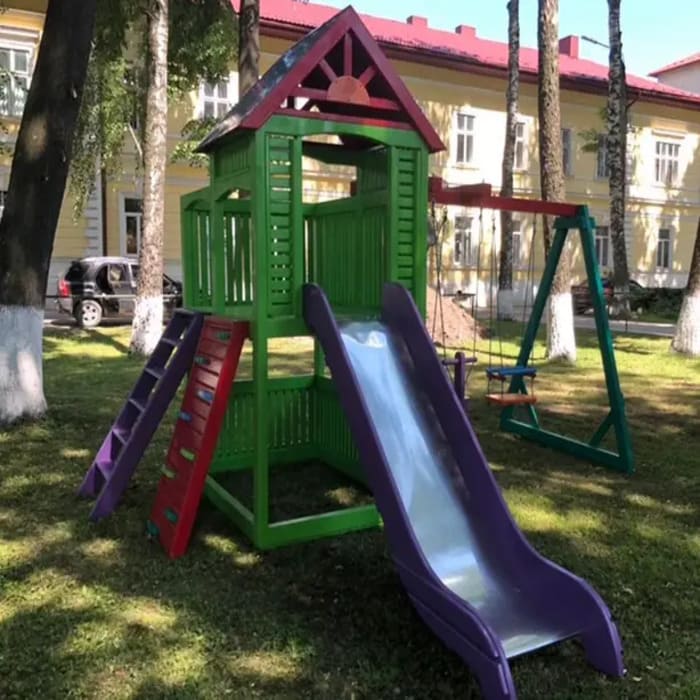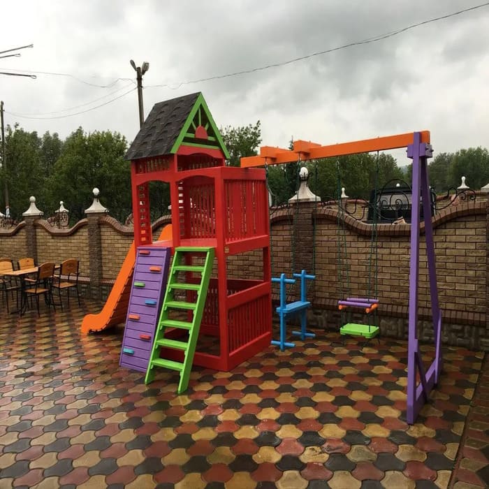 Купить детский игровой комплекс из дерева "Чемпион" не только выгодно, но и практично. Ведь конструкция не имеет острых углов, которые могли бы ранить ребенка, а все детали тщательно шлифуются и полируются, обеспечивая максимально комфортную и безопасную игру малышей на площадке. За краску тоже переживать не следует, мы используем исключительно сертифицированные краски и пропитки, которые абсолютно безопасны для здоровья детей. Поэтому играть на таком игровом комплексе могут даже самые маленькие дети.