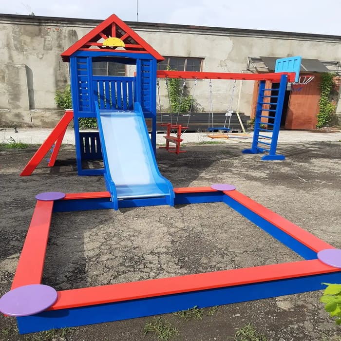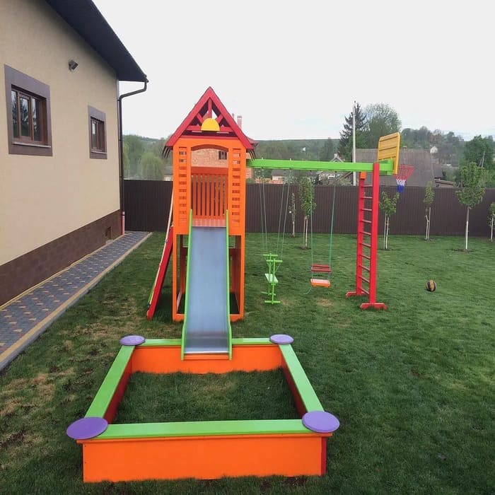 Цветовое исполнение детской площадки остается на усмотрение производителя. В случае, если вы хотите покрасить комплекс в конкретный цвет (или несколько цветов, или с определенной подетальной очередью), то обязательно письменное оформление Спецификации к заказу с вашим личным визированием документа. Кроме того, отмечаем, что цвет изделия на фото может отличаться от фактического цвета товара, что связано с искажением цветов монитором, настройками фотоаппаратуры и другими факторами. Также могут быть два варианта установки горки, поэтому от этого размеры переменные.
