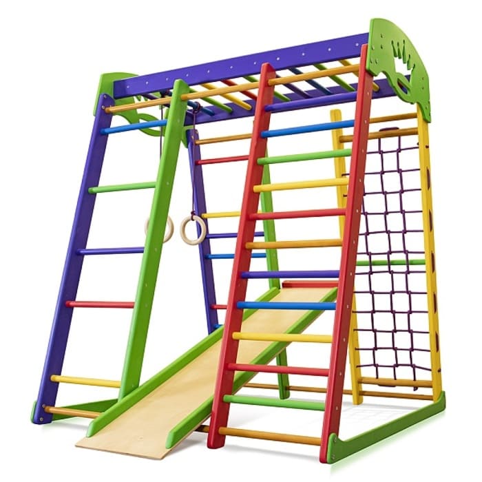 Купить детский спортивный уголок "Акварелька мини" означает сделать огромный вклад в развитие своего ребенка. Это действительно идеальный выбор - ведь такой комплекс станет хорошим вариантом для тренировок дома. Здесь для этого есть все: гимнастические кольца, перекладины, лестницы, сетки и веревки. Для умственной активности в комплексе предусмотрены мольберты для рисования и счета. А для веселой игры уголок спортивный имеет длинную горку. Конструкция крепкая и практичная, может удержать даже самых крупных деток (максимальная нагрузка 60 кг.)