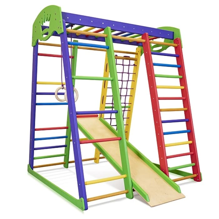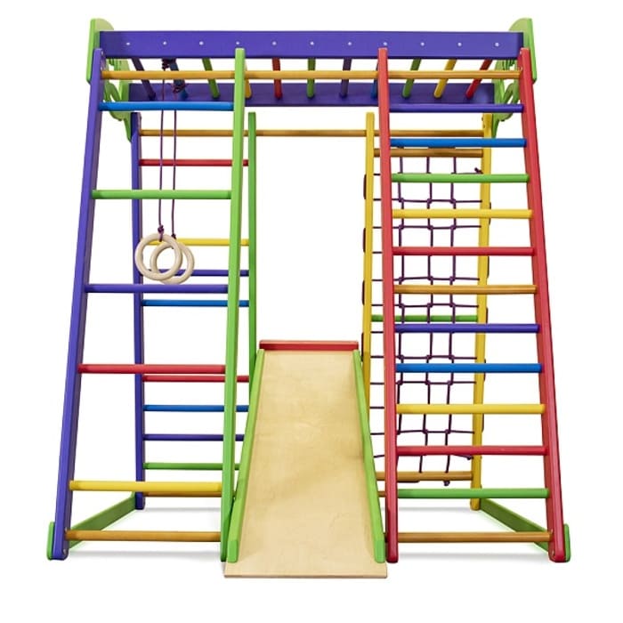 Спортивный комплекс для дома «Акварелька мини» – отличное место для тренировок и веселого времяпровождения дома. Этот уголок станет интересным как для дошкольников, так и детей младшего школьного возраста. Комплектация включает много устройств, благодаря которым малыши смогут и развиваться, как физически, так и умственно, а также веселиться, спускаясь с горки или лазая по гладиаторской сетке.
