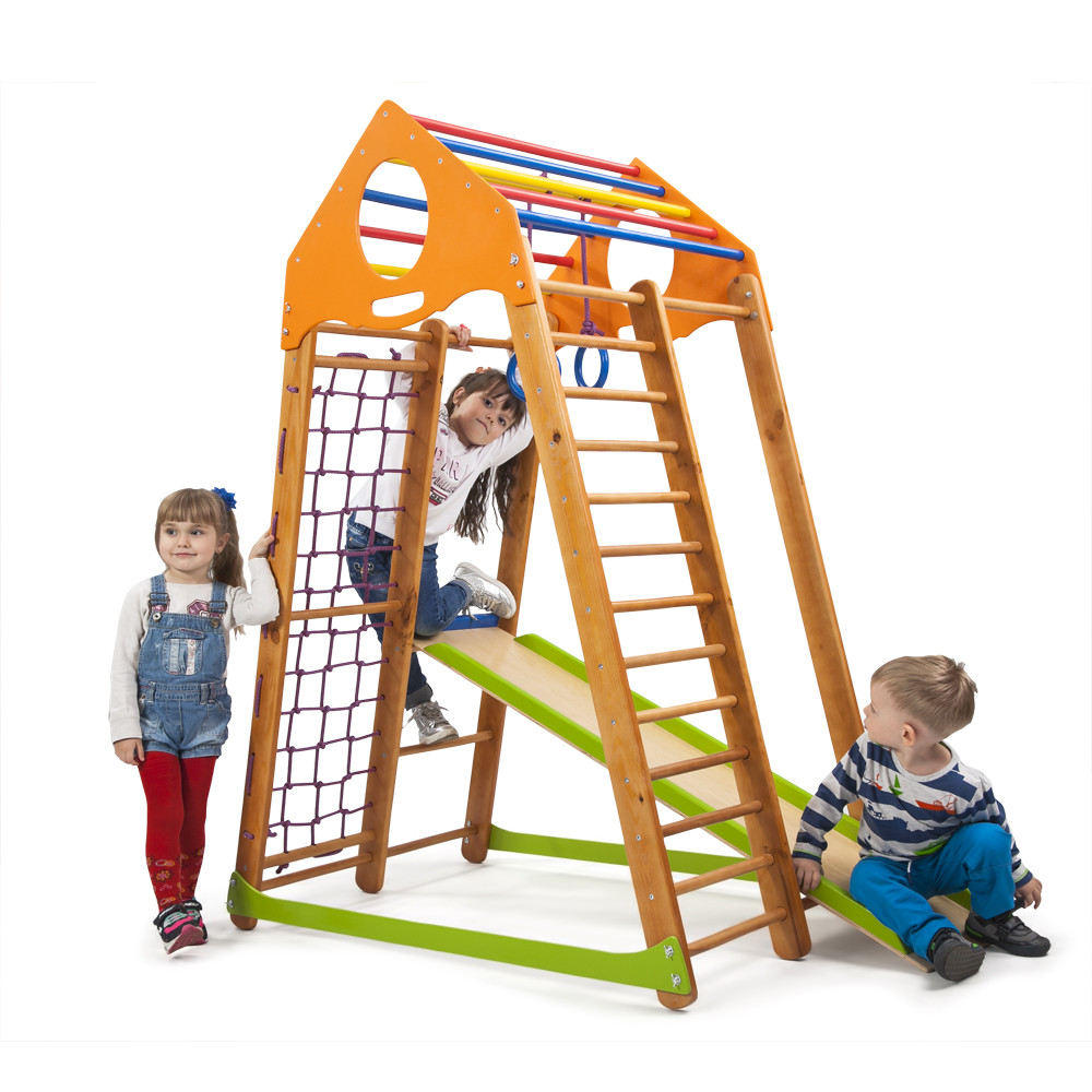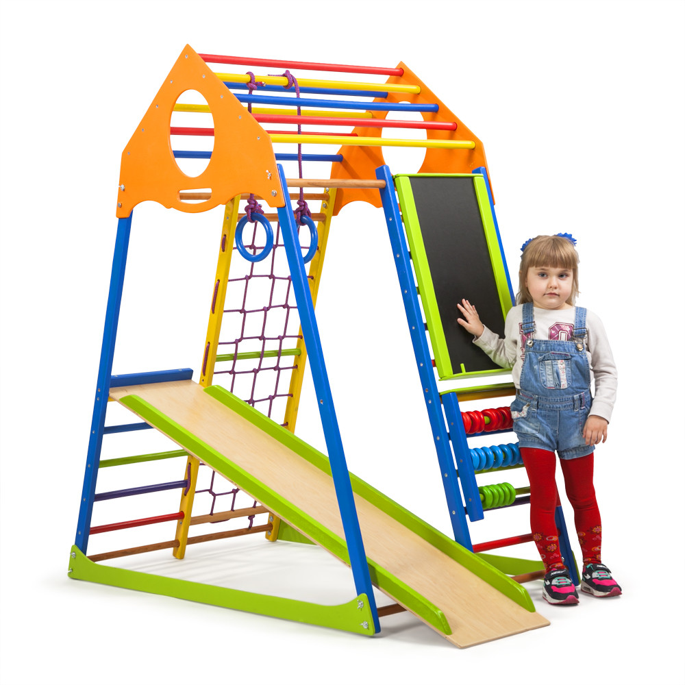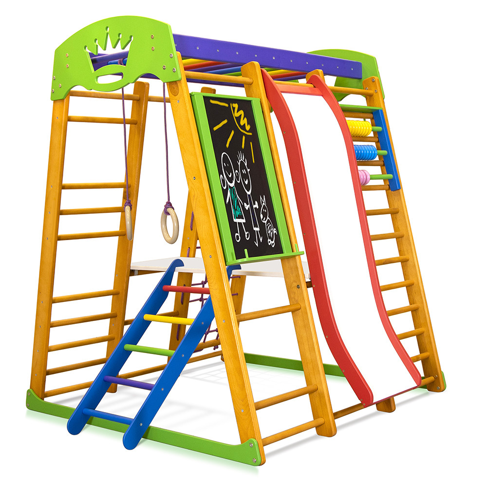 Спортивный комплекс для дома KindWood Color – отличное место для тренировок и веселого времяпровождения дома. Этот уголок станет интересным как для дошкольников, так и детей младшего школьного возраста. Комплектация включает много устройств, благодаря которым малыши смогут и развиваться, как физически, так и умственно, а также веселиться, спускаясь с горки или лазая по гладиаторской сетке.