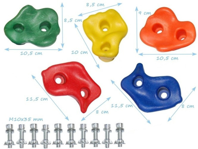 Набор из пяти камней для восхождения в различных цветах. Камни сделаны из прочного пластика. Каждый камень оснащен двумя винтами из нержавеющей стали. Они широко используются в различных типах конструкций или наборов игрового оборудования, также используются отдельно.